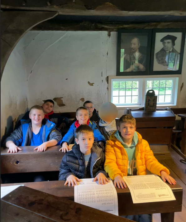Die Klassen GE 5/6a und GE 5/6b haben sich im Fach Geschichte mit dem Thema „Schule früher“ auseinandergesetzt. Am 08.10. stand dazu ein ganz besonderer Ausflug an: Gemeinsam besuchten sie das Museumsdorf in Cloppenburg. Dort nahmen die Schülerinnen und Schüler am Programm „Dorfschulreife“ teil und erlebten eine Unterrichtsstunde wie vor über 100 Jahren. Schnell wurde klar: So eine Schulstunde war damals ganz anders. Die alte Dorfschule war klein, die Holzbänke unbequem und die Regeln sehr streng. Außerdem mussten die Schülerinnen und Schüler in der deutschen Kurrentschrift schreiben – einer alten deutschen Schrift, die gar nicht so leicht zu lesen und zu schreiben ist.
